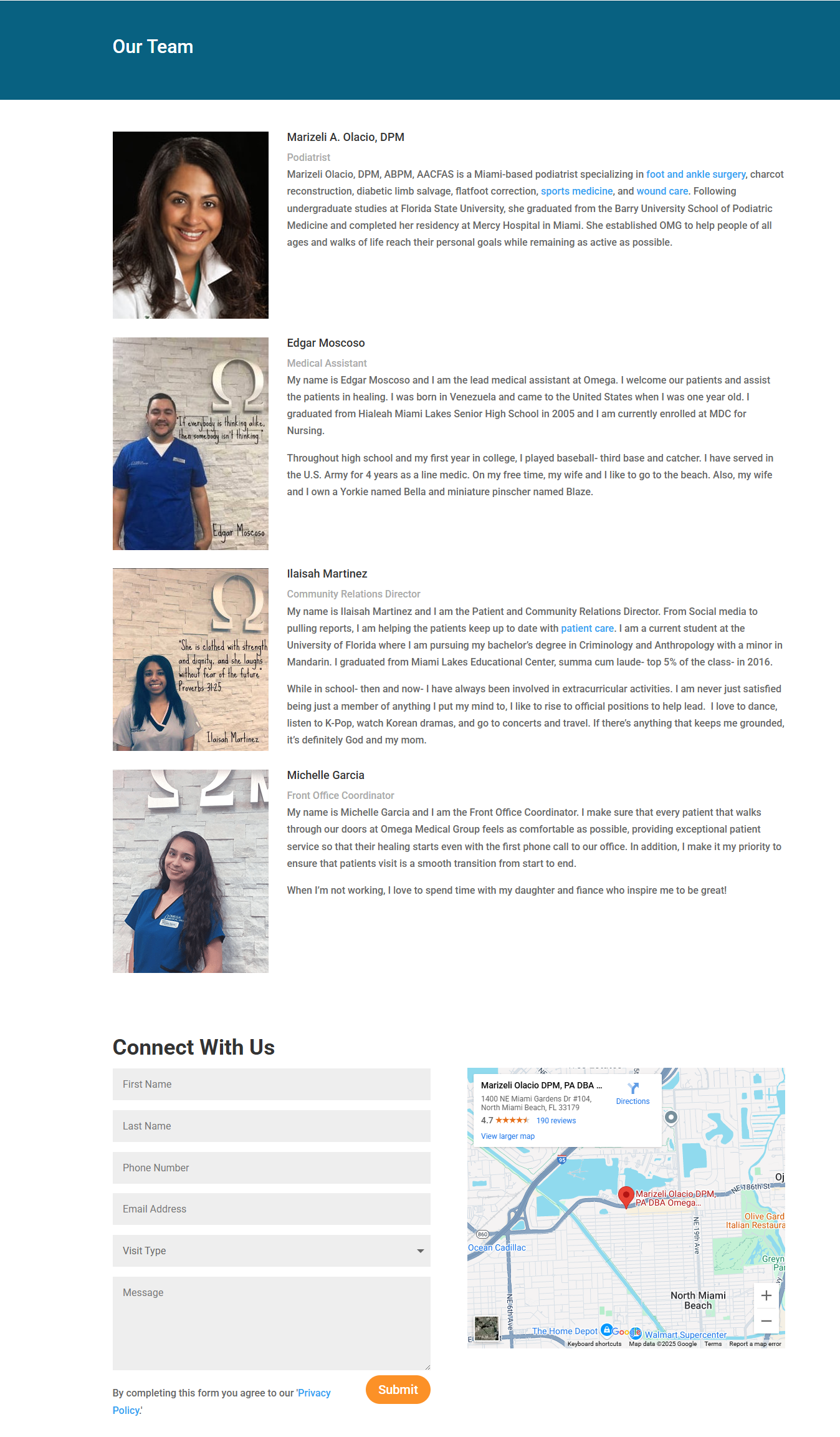 “Dr. Marizeli A. Olacio obtained her Doctor of Podiatric Medicine from the Barry University School of Podiatric Medicine. She completed her residency at Mercy Hospital in Miami. She has over 15 years of experience in the medical field. Dr. Marizeli A. Olacio founded Omega Medical Group with the goal of assisting people of all ages and backgrounds in achieving objectives while maintaining an active lifestyle. The clinic is located just 6.2 miles away from the downtown of Miami Gardens. The clinic is dedicated to addressing the foot and ankle problems of patients from all walks of life and provides individualized attention. She is affiliated with medical facilities such as HCA Florida Aventura Hospital and Doctors Hospital.”